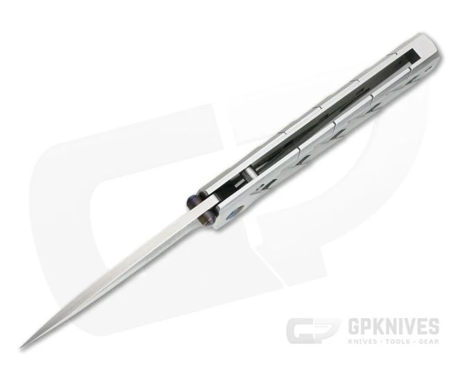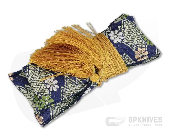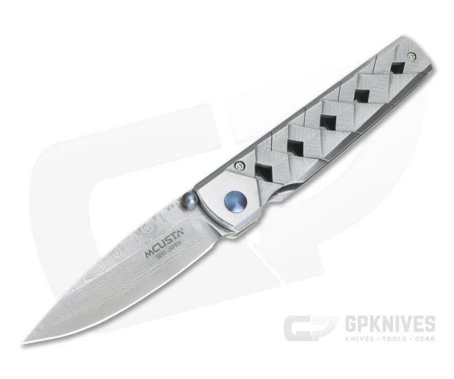 Blade:Â Crafted from San Mai, 33 layer nickel Damascus clad VG10 stainless steel, the drop point blade has a shallow hollow grind for excellent slicing and piercing performance while retaining good durability. It opens smoothly on Teflon washers via dual blue anodized thumb studs. The San Mai clad gives each blade a unique, wavy Hamon design for a striking visual appeal.