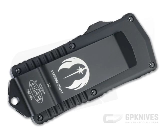 Handle: Tough, lightweight 6061-T6 aluminum in hard anodized black forms the handle with rounded edges and strategic jimping and milled grooves for a comfortable, secure grip. An extra wide “money” pocket clip makes this a prime choice for gentleman’s carry. Proprietary black ringed Microtech hardware, matching lanyard hole knocker end and serialized clip with Jedi insignia round out the construction.