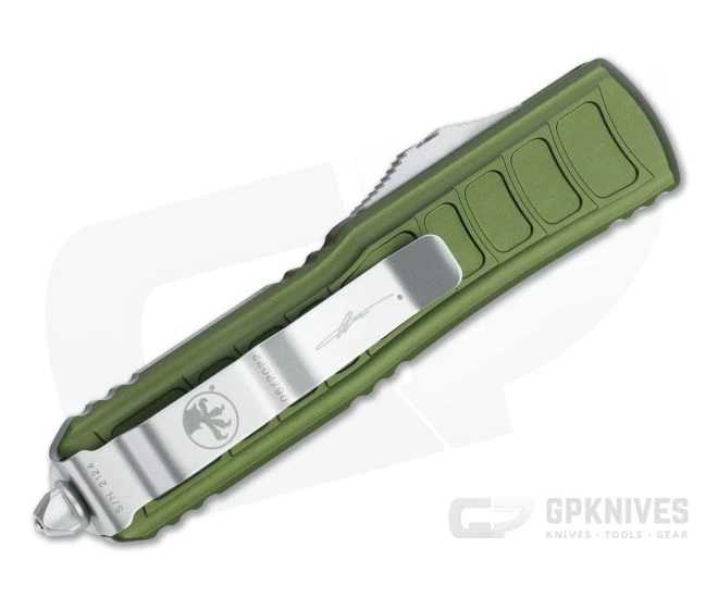 At 15% shorter than the Ultratech (85% the size), the double action out-the-front automatic UTX-85 from Microtech makes an even friendlier everyday carry option than its full-sized cousin. Get the same great design and quality American production in a more compact package. The Signature Series UTX-85 II features Stepside handle milling for enhanced traction and weight reduction. This version has an OD Green handle and stonewashed M390 single edge drop point blade.