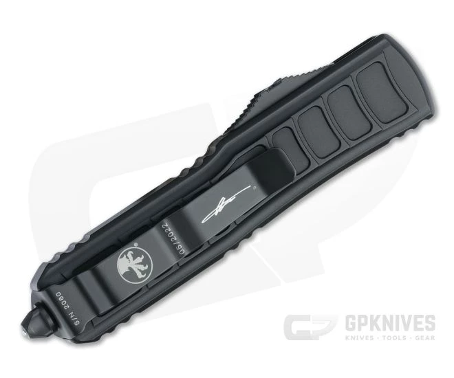 At 15% smaller than the Ultratech (85% the size), the double action out-the-front automatic UTX-85 from Microtech makes an even friendlier everyday carry option than its full-sized cousin. Same great design and quality American production in a more compact package. The UTX-85 II features stepside modified handle milling for enhanced traction and weight reduction. Part of the limited Signature Series this “tactical” version has a black handle with black hardware and a two-tone black finished double edge M390 blade with dual plain cutting edges.