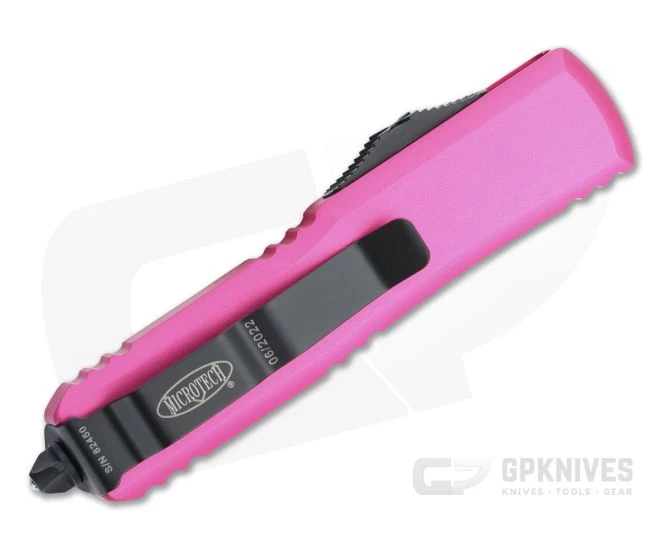 The Microtech UTX-85 (15% shorter than an Ultratech or 85% the size) is a compact yet capable double action out-the-front automatic. Based on the popular Ultratech, the more compact size makes for an even more ideal daily carry option. This version has a pink contoured handle and two-tone black M390, single edge drop point blade.Â