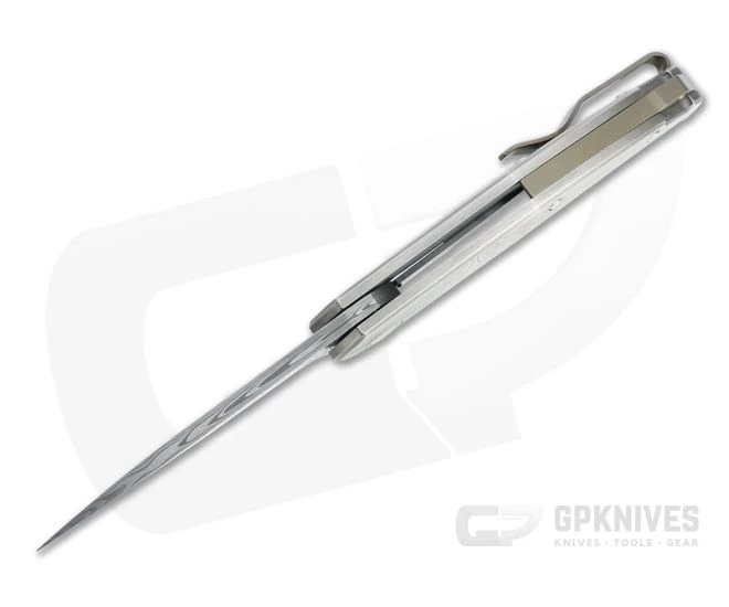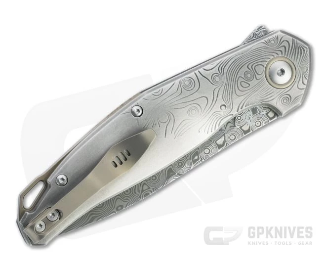Handle:Â Blasted and contoured titanium slabs have a fine brushed finish with a milled pattern similar to the Damascus blade that slowly fades toward the center of the handle. This design has stunning ergonomics with clean, subtle curves and a generous index cutout for a secure grip. An inset stainless steel liner lock provides rock solid lockup and smooth operation. Bronze anodized titanium pivot ring and matching back spacer with Anso-style lanyard loop round out the construction.