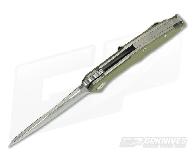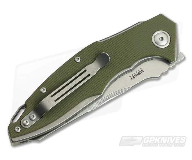 Handle:Â Stonewashed titanium handle slabs are chamfered for comfort and support utilitarian Green G10 overlays. A full titanium backspacer gives the Raut great balance in the hand and provides a generous oval hole for lanyard attachment. The integral frame lock mechanism provides smooth, reliable operation for safe use. The construction is rounded out with Grey Torx hardware along with a right hand, tip-up, titanium pocket clip and dual pivot collars.