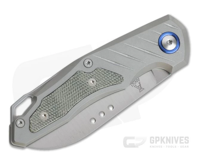 Handle:Â Two slabs of matte gray, sandblasted titanium house the blade and stainless steel back spring. Designed with comfort in mind, the edges are chamfered for a more contoured feel with milled grooves near the pivot for added traction and a “bolstered” look. This version is inlaid with Green Canvas Micarta which is proud to the scales for a fuller feel in hand and added security in the grip. Blue anodized pivot rings and an Anso-style lanyard loop on the back spring round out the construction.