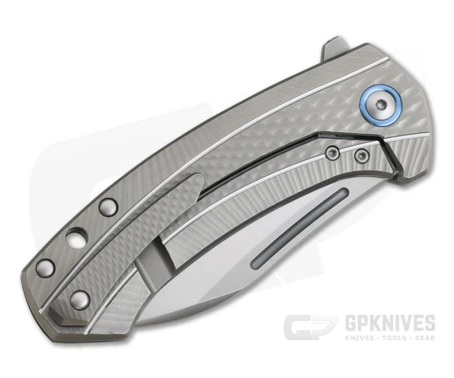 Handle:Â This version comes with 3D textured and contoured titanium handles with integral frame lock construction with hardened steel lock face insert. The dual texture handle milling provides comfort and traction with a semi-open back construction for ease of maintenance. The generous handle design accommodates multiple grip positions and hand sizes. Titanium hardware and blue anodized pivot collar round out the construction with a generous hole provided for lanyard attachment. Includes nylon zip pouch for transport and storage.
