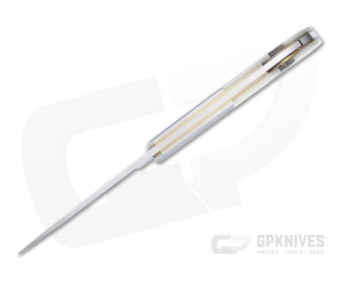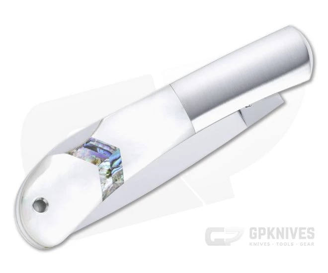 Handle: Traditional brass liner construction supports long, handsome brushed stainless steel bolsters atop beautiful mother-of-pearl covers with abalone chevron ‘arrow’ inlays. The simple back lock construction is seamless and smooth in operation for reliable lockup and secure use. A tube is provided for lanyard attachment.