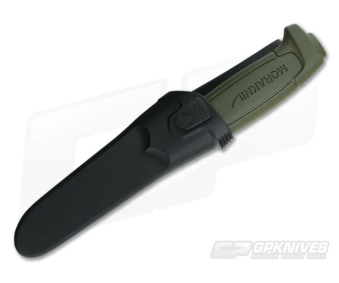 Mora of Sweden Basic 511 Military Green fixed blade knife with a black polymer handle and extremely sharp Scandi-ground Swedish carbon steel blade. The easy to clean textured ergonomic handle has an integrated guard for safety. Includes black molded sheath with belt clip and water drainage hole. Great for your pack, tackle box or tool shed.