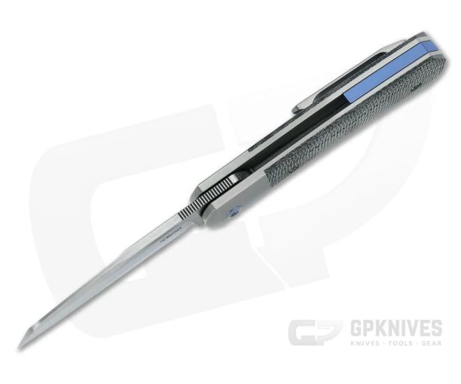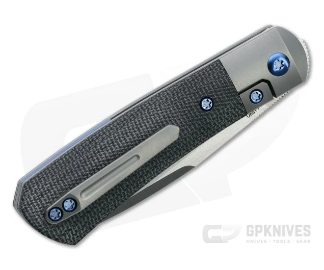 Handle:Â Reminiscent of a classic single blade trapper, the sweeping handle profile consists of two thick titanium liners with integral bolsters supporting rugged black canvas Micarta. Contoured for a comfortable, ergonomic grip the handle delivers solid traction. A cutout in the bolster allows access to the hardened steel lock face equipped liner lock delivering smooth, reliable operation for the life of the knife. Blue anodized hardware and partial back spacer round out the construction.