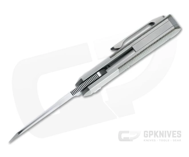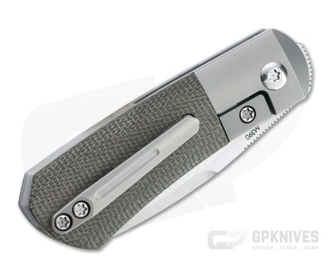 Handle: Thick titanium liners with integral bolsters pair with canvas Micarta covers to form the compact trapper-inspired handle. Contoured for a comfortable, ergonomic grip the handles house the blade and liner lock mechanism with a hardened steel lock face for smooth, reliable operation. A titanium partial back spacer and Torx hardware complete the construction.