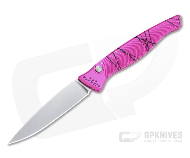 A slim, ultralight, gentleman’s carry EDC automatic, the Piranha DNA delivers 3.25 inches of cutting edge in a sub-2 ounce package that is less than an inch wide closed for exceptionally easy carry. Aircraft grade aluminum houses the S30V blade and button lock automatic mechanism for fast deployment and secure lockup with helix milling on the sides for a secure, comfortable grip. This version comes with a mirror polished blade and hot pink hard anodized aluminum handle.
