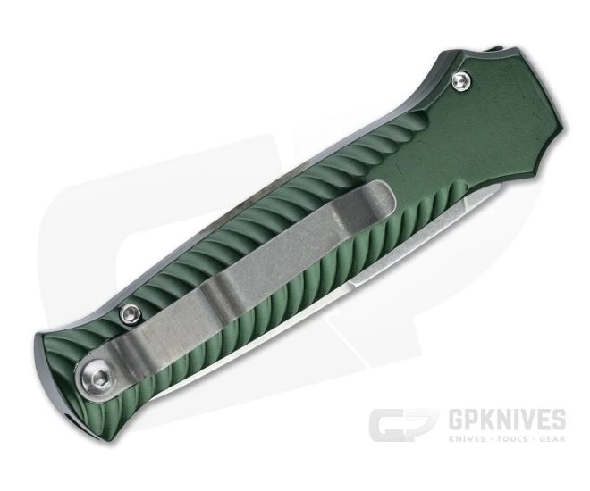 A smaller and lighter version of the Bodyguard, the Piranha Miniguard delivers the same classic dagger-like spear point, symmetrical handle and authoritative automatic deployment in a more EDC friendly platform. Lightweight, rugged 6061-T6 aluminum construction pairs with a high performance, S30V blade for all around utility. Compact and discreet in carry, the Miniguard makes a great gentleman’s tactical carry. This version comes with a stonewashed blade and green anodized aluminum handle.