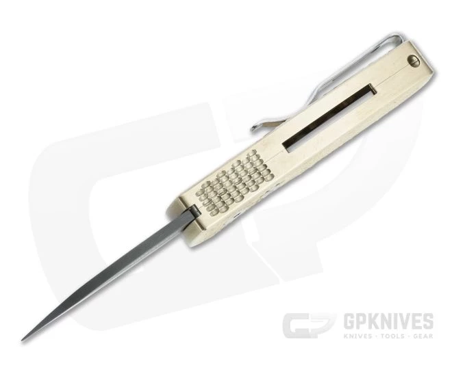 Handle:Â Made of solid bronze AL the handle is robust and hand filling. Bronze aluminum is a premium alloy that delivers solid heft in the hand and will develop a unique natural patina with time and handling, though slower than standard bronze. A subtle choil, tapered end and dimpled spine jimping pair with the textured milling on the flats for a secure grip and an appealing bright finish complemented by satin chamfers and edges. The button lock is smooth, solid, and secure for safe operation.