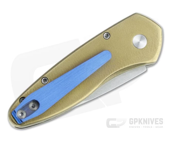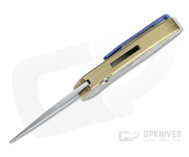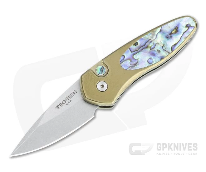 The Protech Knives Sprint is a California Legal automatic knife that is one of the lightest and thinnest automatic knives available. This is a high performance dress carry automatic that carries like a feather and performs like a razor. The Sprint features all the cornerstones of Protech construction: modern materials, high-tech manufacturing, advanced coil spring mechanism, and American production quality. This 2022 Custom Sprint has a stonewashed CPM-S35VN blade, orange peel bronze anodized titanium frame with abalone front inlay, abalone button and blue milled titanium clip.