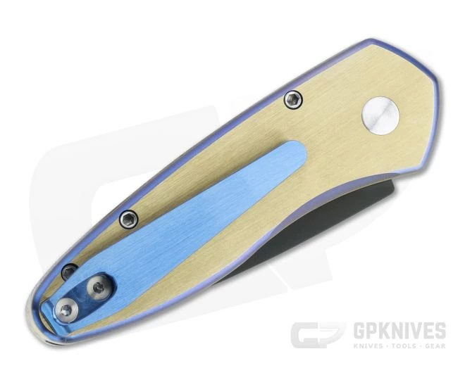 The Protech Knives Sprint is a compact daily carry automatic offering modern materials, high-tech manufacturing, advanced coil spring mechanism, and American production with dress carry style. This full titanium custom limited comes with a black DLC coated CPM-S35VN blade, two-tone bronze and blue 3D wave cnc milled titanium handles, milled titanium clip and pearl button inlay.