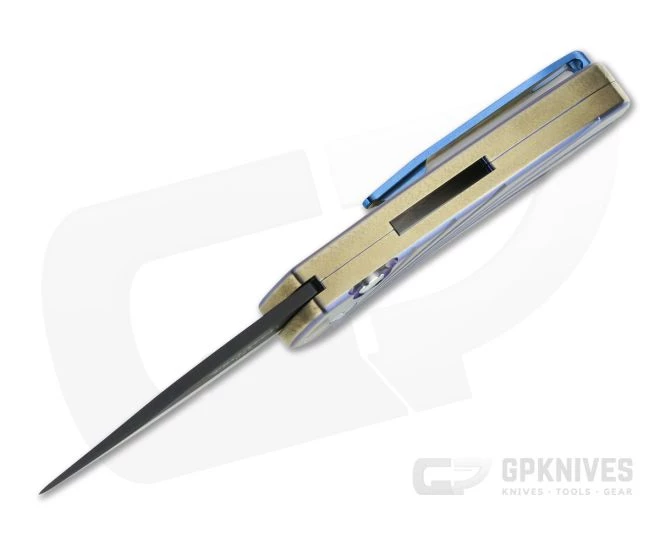 Handle:Â Solid titanium forms the compact handle, tapered for a secure grip and custom finished inside and out. Edges are orange peel textured and anodized bronze to match the hand rubbed satin flats. The front has a milled 3D wave pattern anodized in blue matching the chamfers, clip and jeweled handle interior. Smooth, solid, and secure the button lock is easy to operate and inlaid with pearl completing this high style dress carry automatic.
