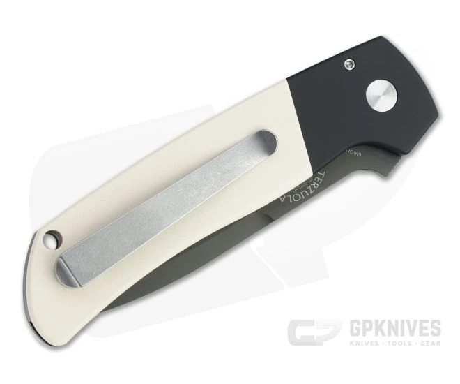The Protech Terzuola ATCF Auto is a production automatic version of Bob Terzuola’s iconic Advanced Technology Combat Folder design. Working side by side with the Godfather himself, Protech has delivered a precision American manufactured automatic ATCF with custom appeal. The Terzuola ATCF introduces the superb Magnacut stainless steel to the Protech line and features button and handle inlays, a Terzuola style milled titanium clip and logo etching. This “tuxedo” version comes with a black DLC coated blade, black frame with ivory white paper Micarta inlays and matching inlaid button.
