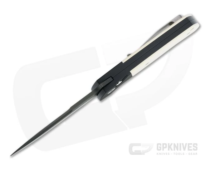 Handle: Dual slabs of black hard anodized aluminum form the frame and integral bolsters supporting precision fit ivory Micarta scales for a premium look and feel. The large handle offers a full grip with a subtle ergonomic design that is comfortable in multiple positions. The milled stonewashed titanium clip gives added traction, perfect for the strong automatic blade deployment while the button lock provides strong, secure lockup for safe use.