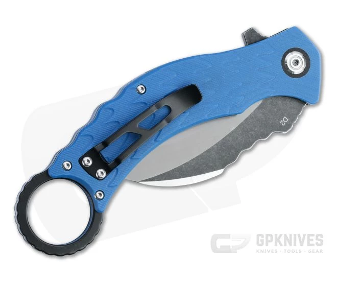 The QSP Eagle is a powerful daily carry karambit with talon like hawkbill blade and feather texture G10 scales for traction and style. This liner lock flipper is fast, smooth and solid making it ideal for utility and defensive use. This version comes with a two-tone D2 tool steel blade and blue G10 scales with black pivot collars.