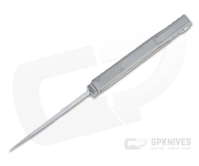 The Exoskeleton Design Reate EXO is a simple and ingenious manual out-the-front knife. Essentially a three-piece construction, the EXO consists of a blasted gray titanium frame, matching Micarta inlaid yoke and the two-tone Elmax blade. Operation is simple: hold the yoke in a pinch grip and let the frame drop. The blade slides freely in its track in the frame, tip the handle down to deploy and up to retract. Hold the frame and yoke together to secure the blade pin for use or carry. This version has a single edge drop point blade and brown canvas Micarta inlays.