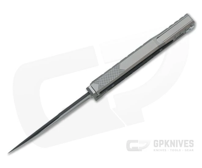 The Exoskeleton Design Reate EXO is a simple and ingenious manual out-the-front knife. Essentially a three-piece construction, the EXO consists of a blasted gray titanium frame, matching G10 inlaid yoke and the two-tone Elmax blade. Operation is simple: hold the yoke in a pinch grip and let the frame drop. The blade slides freely in its track in the frame, tip the handle down to deploy and up to retract. Hold the frame and yoke together to secure the blade pin for use or carry. This version has a two-tone black PVD, single edge drop point blade and black G10 inlays.