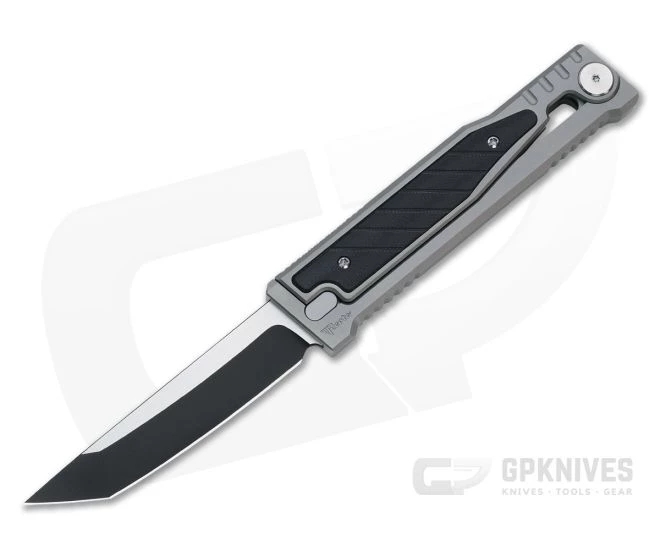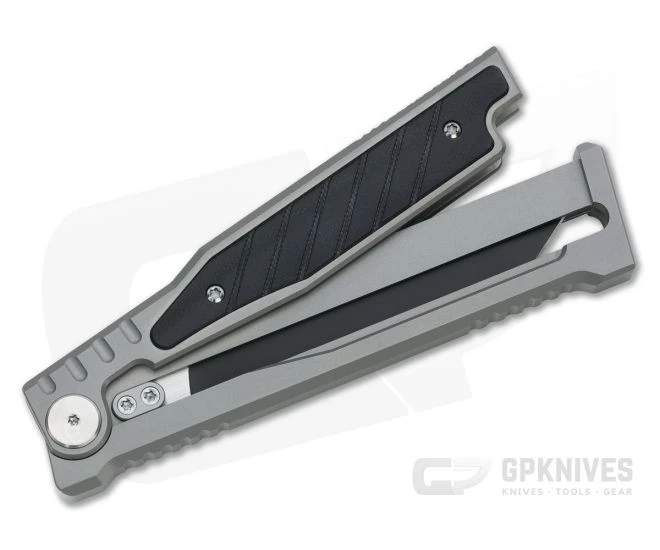 The Exoskeleton Design Reate EXO is a simple and ingenious manual out-the-front knife. Essentially a three-piece construction, the EXO consists of a blasted gray titanium frame, matching G10 inlaid yoke and the two-tone Elmax blade. Operation is simple: hold the yoke in a pinch grip and let the frame drop. The blade slides freely in its track in the frame, tip the handle down to deploy and up to retract. Hold the frame and yoke together to secure the blade pin for use or carry. This version has a single edge Tanto point blade with two-tone black PVD finish and black G10 inlays.