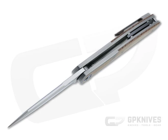 Handle:Â Bead blasted matte gray titanium forms frame and integral bolsters with Micarta overlays for the scales and matching bolster inlays. The rear bolster and frame forms the lock which delivers solid secure lockup and smooth operation thanks to a hardened steel lock face insert. Titanium hardware including custom pivot and blue anodized pivot collar round out the construction. Includes hook and loop pouch for strange and transport.