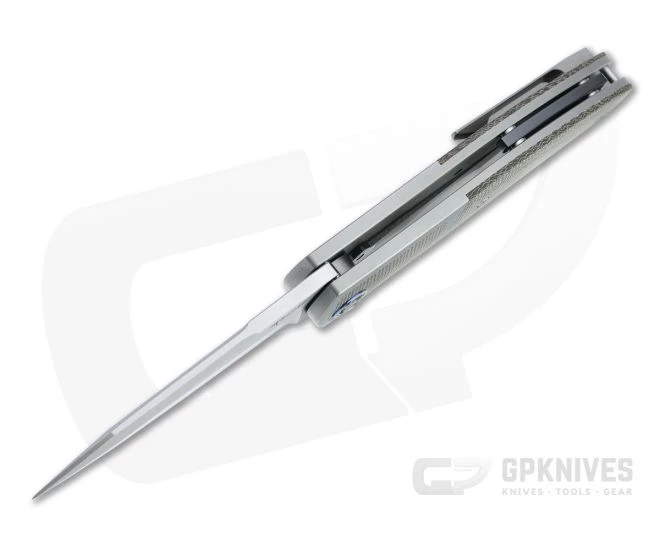 Handle: Bead blasted matte gray titanium forms frame and integral bolsters with Micarta overlays for the scales and matching bolster inlays. The rear bolster and frame forms the lock which delivers solid secure lockup and smooth operation thanks to a hardened steel lock face insert. Titanium hardware including custom pivot and blue anodized pivot collar round out the construction. Includes hook and loop pouch for strange and transport.