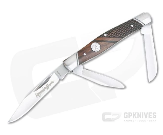 Handle:Â Polished Nickel Silver bolsters frame warm, Wood covers that are partially milled with a diamond texture offering a comfortable, secure grip and visual appeal. The covers are fitted with stainless pins to brass liners and adorned with the Remington “R” shield on the front. The sturdy back springs offer simple, smooth slip joint operation.