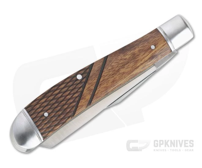 The Trapper is a classic slip joint pattern with a rounded end handle which tapers slightly towards the blade end and is generally equipped with two blades opening from the same end. The Medium Trapper is the second largest of this pattern and comes in a classic, two-blade configuration with a clip point and Spey blade. This Remington Heritage Series version comes with flat ground 420J2 blades, wood covers and nickel silver bolsters.