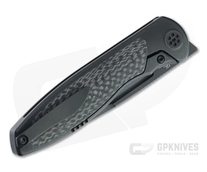 Handle: Contoured and black PVD coated titanium slabs form the handle supporting stunning carbon fiber inlays and forming a reliable and rock solid integral frame lock. A hardened steel lock face makes for smooth operation and long term reliability and includes the SBD Integral detent detailed below. The minimalist handle design is ergonomic in a variety of grips and secure in the hand without the need for aggressive texture making it fast in the hand. Black PVD coated hardware rounds on the construction.