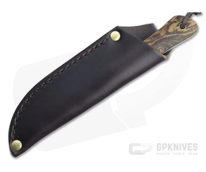 Handle: Flared brass pins securely attach the stunning Bocote wood handle scales to the full tang over black fiber liners. Shaped and contoured for comfort, this handle is designed for extended use, with an index cutout and pommel swell for a secure grip. An attached leather lanyard provides added security and grip in use.