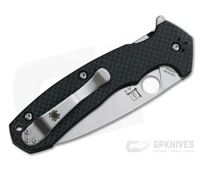 Handle: The nested liner construction supports Carbon Fiber/G10 composite scales which keep the Amalgam light in weight while providing strength and traction in the hand. The full length handle gives a full, 4-finger grip even when wearing gloves. The Spyderco Compression Lock delivers smooth operation and a strong and secure lock up for reliability in adverse conditions. An open back construction makes for easy cleaning and maintenance. A lanyard tube is placed at the rear of the handle for easy lanyard attachment while retaining optimal pocket clip placement.