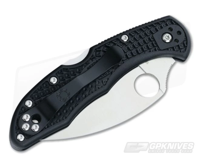 Handle:Â Spyderco’s Bi-directional textured FRN in classic black offers exceptional traction in the hand with contoured edges and an ergonomic design that delivers comfort in the hand until the job is done. The sturdy mid-back lock design is easy to operate and comes with the Boye Dent further enhancing the security by preventing accidental disengagement of the lock when gripping the handle with heavy pressure. A hole at the pommel end allows for easy lanyard attachment.