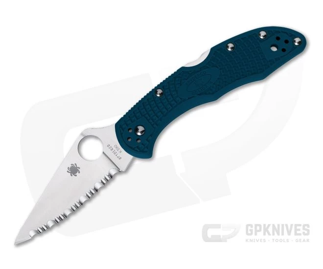 Spyderco’s Delica has been a cornerstone of their everyday carry product line since its introduction in 1990. The 4th Generation of the Delica lightweight was upgraded with a 13 mm RoundHole, spine jimping, reinforced blade tip, skeletonized liners, Bi-Directional Textured FRN scales and a four-position screw on clip. This version comes with a flat ground, fully serrated modified drop point blade of satin finished Bohler K390 tool steel blade and dark cyan blue FRN handles.