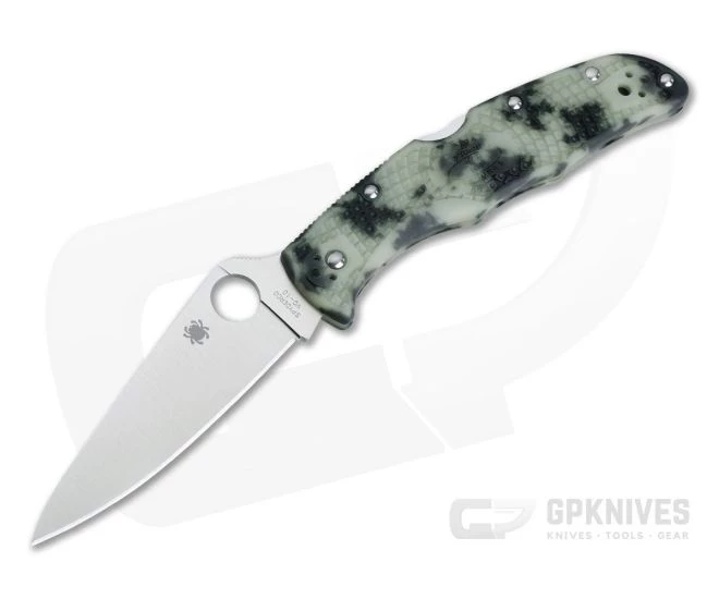 Blade:Â Fully flat ground VG10 stainless steel comes in a modified drop point with a razor sharp plain edge and stunning satin finish. Spyderco’s ambidextrous Round Hole opener makes for smooth, easy, one hand operation. Present as well is the jimped thumb ramp for added control in both fine and heavy work. Just under 3.5 inches of cutting edge makes this an excellent cutting tool you will want to have with you every day.
