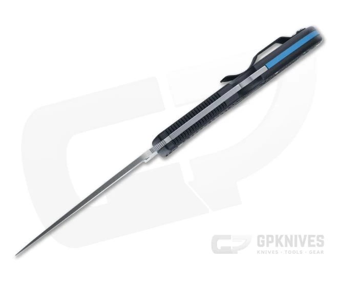 Handle: Black Bi-directional textured FRN provides exceptional traction in all conditions with contoured edges and an ergonomic design that delivers comfort in the hand until the job is done and nearly 5 inches of grip area for the largest of gloved hands. Bright blue liners and spacer offer a subtle contrast while the sturdy mid-back lock delivers secure operation further enhanced by the Boye Dent on the lock bar which prevents accidental disengagement of the lock when gripping with heavy pressure. A hole at the pommel end allows for easy lanyard attachment.