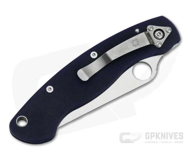 Designed by Sal Glesser to meet the requirements of a high-performance, light-weight folder designed for hard use the Spyderco Military was an answer to the question: “If your son were going into the military what folding knife would you send him with?” The precursor to the popular EDC Paramilitary 2, the Military has a similar clip point blade with large 14 mm Round Hole for ease of operation with gloves and a jimped choil and thumb ramp for optimal control. Nested, skeletonized stainless steel liners support G10 scales for a solid balance of lightweight durability and ease of maintenance. Where ever life may take you the Spyderco Military is a folding knife you can count on. This version comes with dark blue G10 handle scales and an upgraded, CPM-S110V stainless steel blade.