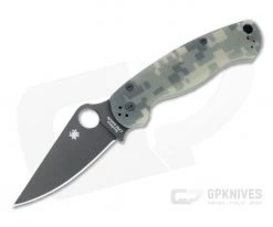 The Spyderco ParaMilitary 2 folding knife has become one of the world’s most popular pocket knives. The size, blade shape and overall fit and finish make it a classic end users just keep coming back for. This version of the PM2 has a black DLC coated S45VN blade with matching hardware and liners and digicam camo G10 handle scales.