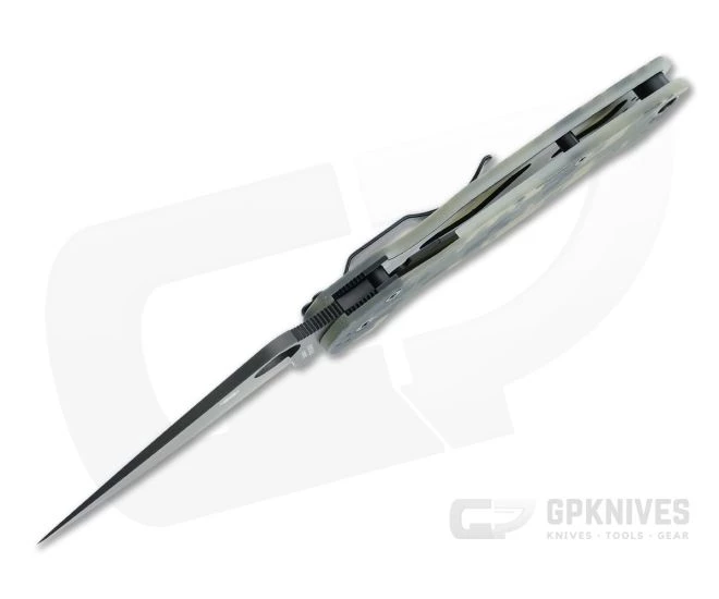 Handle: Textured camo G10, an industrial fiber glass composite laminate, deliver tough, lightweight and nearly impervious handle scales. Nested and skeletonized black stainless steel liners support the scales, reducing weight while maintaining a high level of strength. One liner forms the easy to operate Compression Lock mechanism.