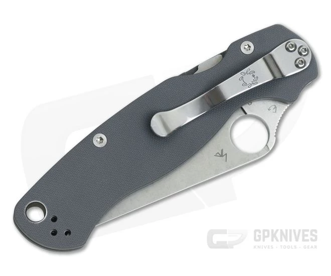 Handle:Â The scales are made from textured Dark Gray G10, an industrial fiber glass composite laminate, which is tough, lightweight and nearly impervious to decomposition and moisture. The scales are attached to nested and skeletonized stainless steel liners which help to reduce weight while maintaining a high level of strength. One liner forms the high strength Compression Lock mechanism which is easy to operate with either hand and has an exceptional strength to weight ratio. The Para Military 2 carries via the classic, stainless steel, Spyderco 4-Position “Hour Glass” pocket clip which makes this knife fully ambidextrous.