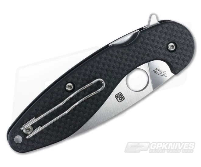 Handle:Â The blade is swallowed by Peel-ply Carbon Fiber/ G10 laminate handle scales that are mounted over inset, skeletonized stainless steel liners in an open back construction. One of the stainless liners is used for the Compression lock which is smooth and simple to operate while providing rock solid security. This is a winning combination of traction, light weight, durability, and style. The handles are designed with a large index finger contour that keeps the footprint of the closed knife very small while also allowing access to the SpyderHole for opening. The Sliverax carries via an ambidextrous, tip-up, stainless steel wire clip that offers secure and discreet in-pocket carry.