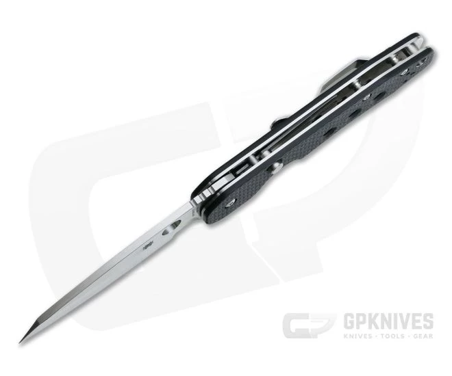 Handle:Inset stainless steel liners support carbon fiber/G-10 laminate scales with three milled hole and peel-ply texturing for security in hand. A compression lock mechanism provides smooth and reliable lockup and is operated via an external button which allows for more intuitive disengagement with all the strength of the original. An open back construction allows for easy of cleaning and maintenance while the extra large lanyard hole rounds out the construction.