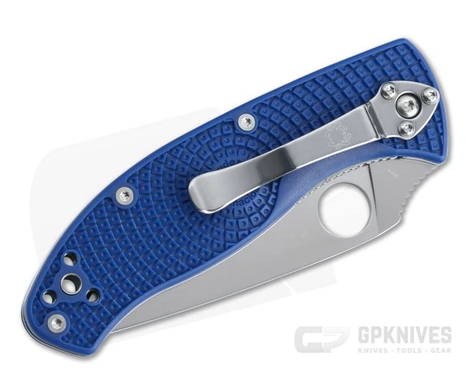 Handle: An open back construction with stainless steel spacers allows for easy cleaning and maintenance. Skeletonized stainless steel liners support lightweight, durable and weather resistant fiberglass reinforced nylon (FRN) scales attached with Torx screws. The FRN scales are molded with Spyderco’s Bi-Directional texturing offering unparalleled traction for security during use in the most adverse conditions. The front scale has a relief cutout in the handle for access to a jimped liner lock for easy operation and added security in the hand. A generous hole is provided for lanyard attachment.