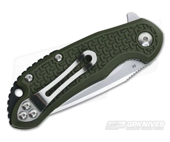 The Handle:Â The OD Green FRN handle is smooth around the edges with an inset texture pattern providing a solid grip. Rest your grip directly behind the flipper tab/guard or expand on that by using the choil. It actually makes the handle seem longer. There are full length stainless liners backing up the FRN. The show side in completely skeletonized for weight reduction while the lock is only slightly, as it creates the liner locking system. A slightly exposed notched FRN back spacer adds to the overall feel, superior balance and lanyard opportunity of the Mini Cutjack. A tip up pocket clip is included that may be flipped for lefty carry.Â