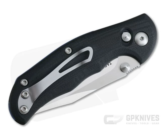 Blade:Â The Bowie-style clip point blade has plenty of belly for slicing and a fine yet durable tip for piercing and detail work. Executed in a pristine satin finish the high height saber grind delivers a good balance of strength and cutting performance while the upper swedge gives the Tasso some style. A small section of jimping right above the double thumb stud openers offers added traction and control. Bronze washers at the pivot make for smooth operation of the blade with dual studs for ambidextrous thumb deployment.