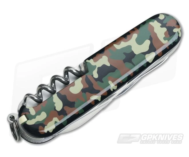 Victorinox Huntsman Swiss Army Knife with Swiss stainless steel components and camouflage celluloid handle. Includes stainless steel lanyard ring.