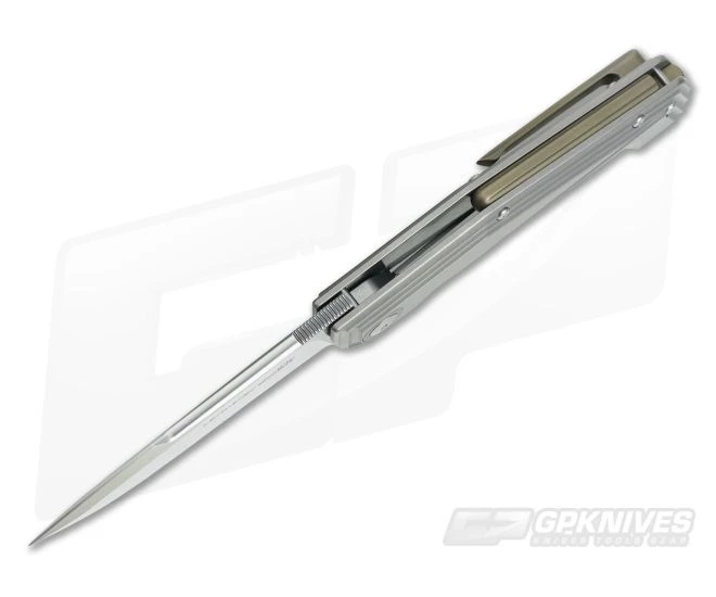 The Handle: The handles are made from stonewashed, CNC milled titanium that feels great in the hand even with the futuristic look. An inset stainless steel liner gives solid lock up and solid titanium backspacer is CNC machined and anodized for a pop of color which matches the pivot collars. The knife carries via a tip-up, right-hand only milled titanium pocket clip which is CNC machined and anodized to match the backspacer and pivot collars. A lanyard pin in the backspacer allows for inline attachment of a lanyard.