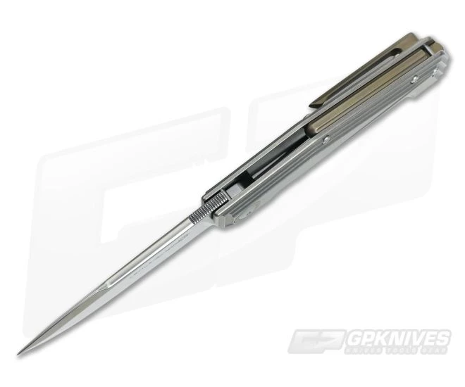 The Handle:Â The handles are made from stonewashed, CNC milled titanium that feels great in the hand even with the futuristic look. An inset stainless steel liner gives solid lock up and solid titanium backspacer is CNC machined and anodized for a pop of color which matches the pivot collars. The knife carries via a tip-up, right-hand only milled titanium pocket clip which is CNC machined and anodized to match the backspacer and pivot collars. A lanyard pin in the backspacer allows for inline attachment of a lanyard.