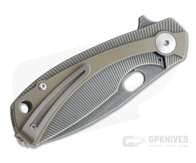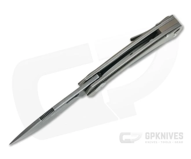 Handle: The handles are made from Black Stonewashed, CNC milled titanium that feels great in the hand. The sweeping Carbon Fiber overlay adds a contoured feel to the handle as well as added visual interest. The titanium liner lock gives solid lock up for secure operation. The small titanium back spacer is color matched to the overlay and end mounted pocket clip while a generous hole at the pommel makes for easy lanyard attachment.