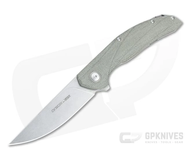 A beautiful collaboration between iconic Danish custom knife maker Jens Anso and Viper Tecnocut, the Orso is exemplary of the “form follows function” design principle. The Orso 2 retains the striking lines and sturdy construction of the original delivering it in a frame lock design. The same Anso trademark design features pair with contoured milling for an even more appealing look while retaining a practical functionality that begs to be put to work. This version has a stonewashed LO-QPM 20-4 stainless steel blade with matching titanium frame and green canvas Micarta front scale.